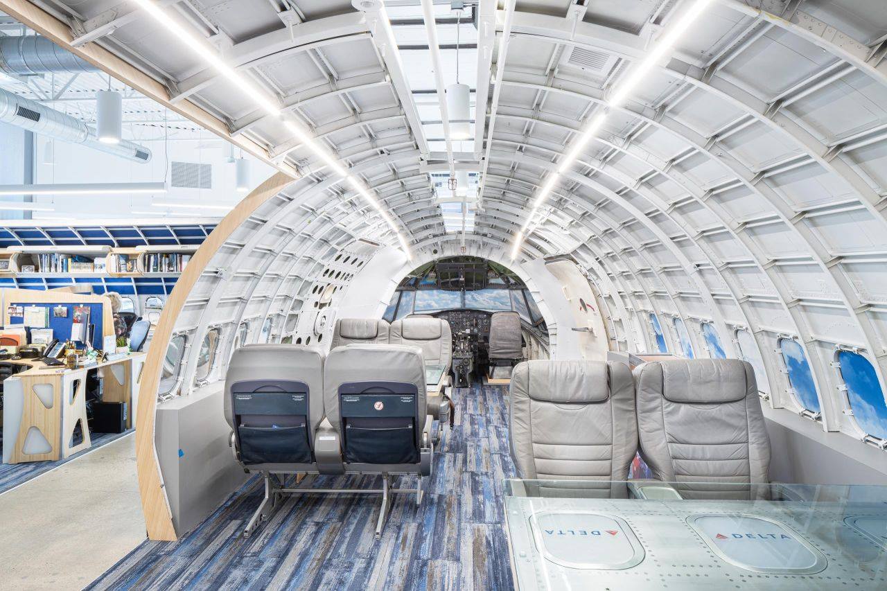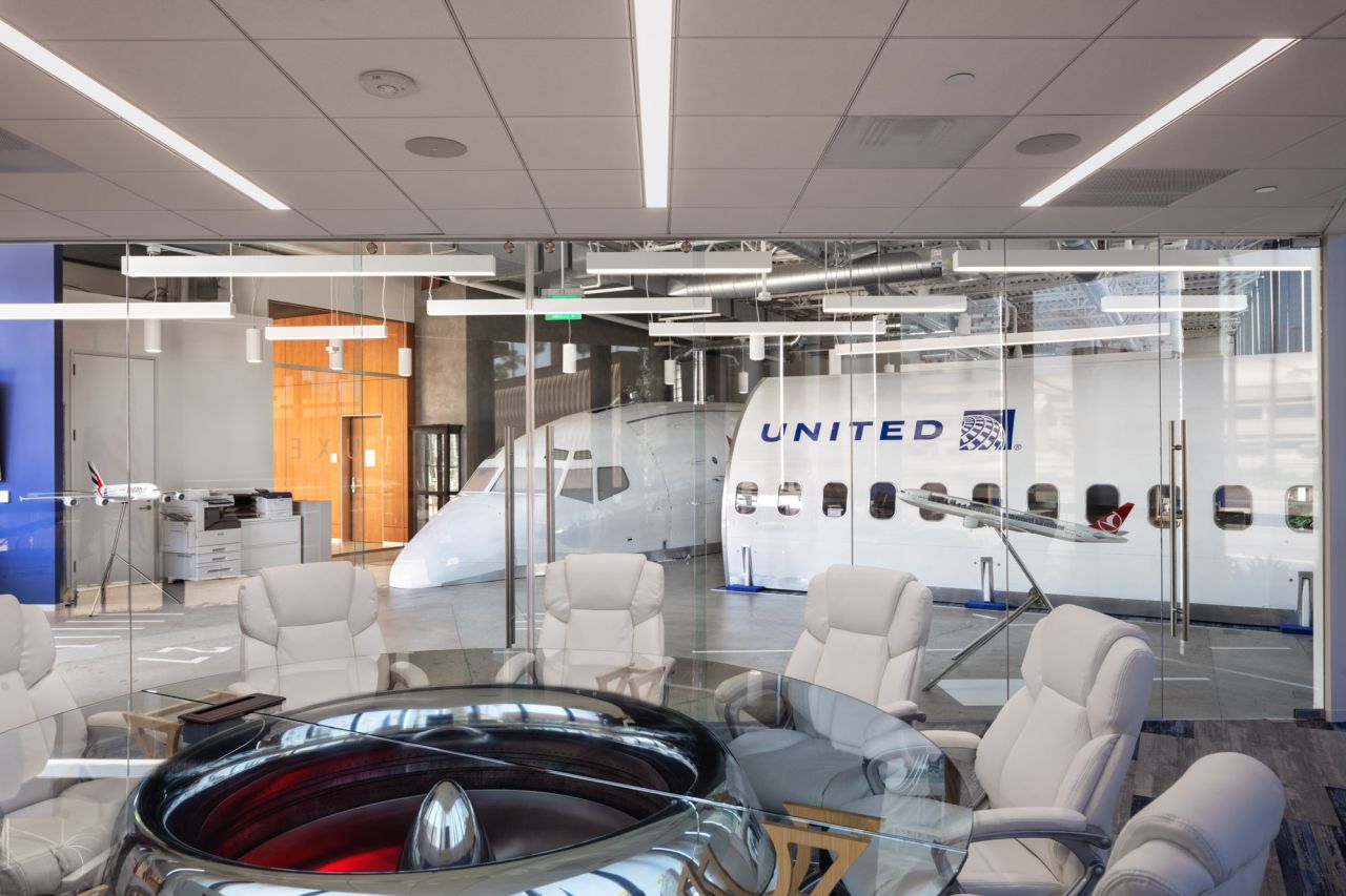 This one-of-a-kind renovation redefines what an office can be. For their Irvine headquarters, LUXE Travel Management repurposed actual sections of a retired commercial airplane—transforming a 51′-6″ stretch of fuselage, including the cockpit, into a fully immersive open office experience. Structural coordination was critical in adapting the existing building to support the placement and integration of the aircraft components. The layout now features shared workstations aligned with real airplane windows and a custom-built kitchen and breakroom that evoke the interior of a private jet.